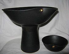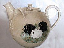 Arbetar med stengodslera och porslinslera, med bland annat underglasyrmålning. Små förgyllningar på svart och vit glasyr. Har egen verkstad och gårdsbutik.